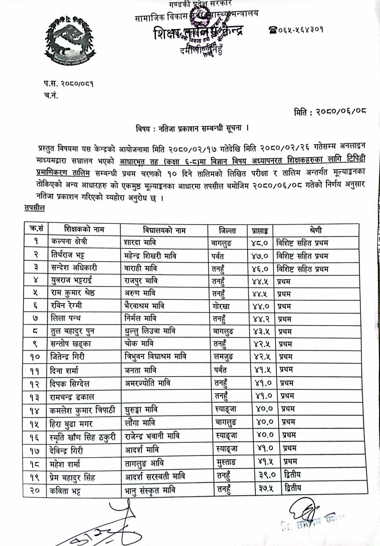 मिति २०८०/०२/१७ गतेदेखि मिति २०८०/०२/२६ गतेसम्म अनलाइन माध्यमद्वारा सञ्चालन भएको आधारभूत तह (कक्षा ६-८) मा विज्ञान विषय अध्यापनरत शिक्षकहरुका लागि टिपिडी प्रमाणिकरण तालिम सम्बन्धी प्रथम चरणको १० दिने तालिमको नतिजा Download: मिति २०८०/०२/१७ गतेदेखि मिति २०८०/०२/२६ गतेसम्म अनलाइन माध्यमद्वारा सञ्चालन भएको आधारभूत तह (कक्षा ६-८) मा विज्ञान विषय अध्यापनरत शिक्षकहरुका लागि टिपिडी प्रमाणिकरण तालिम सम्बन्धी प्रथम चरणको १० दिने तालिमको नतिजा Share Tweet Share